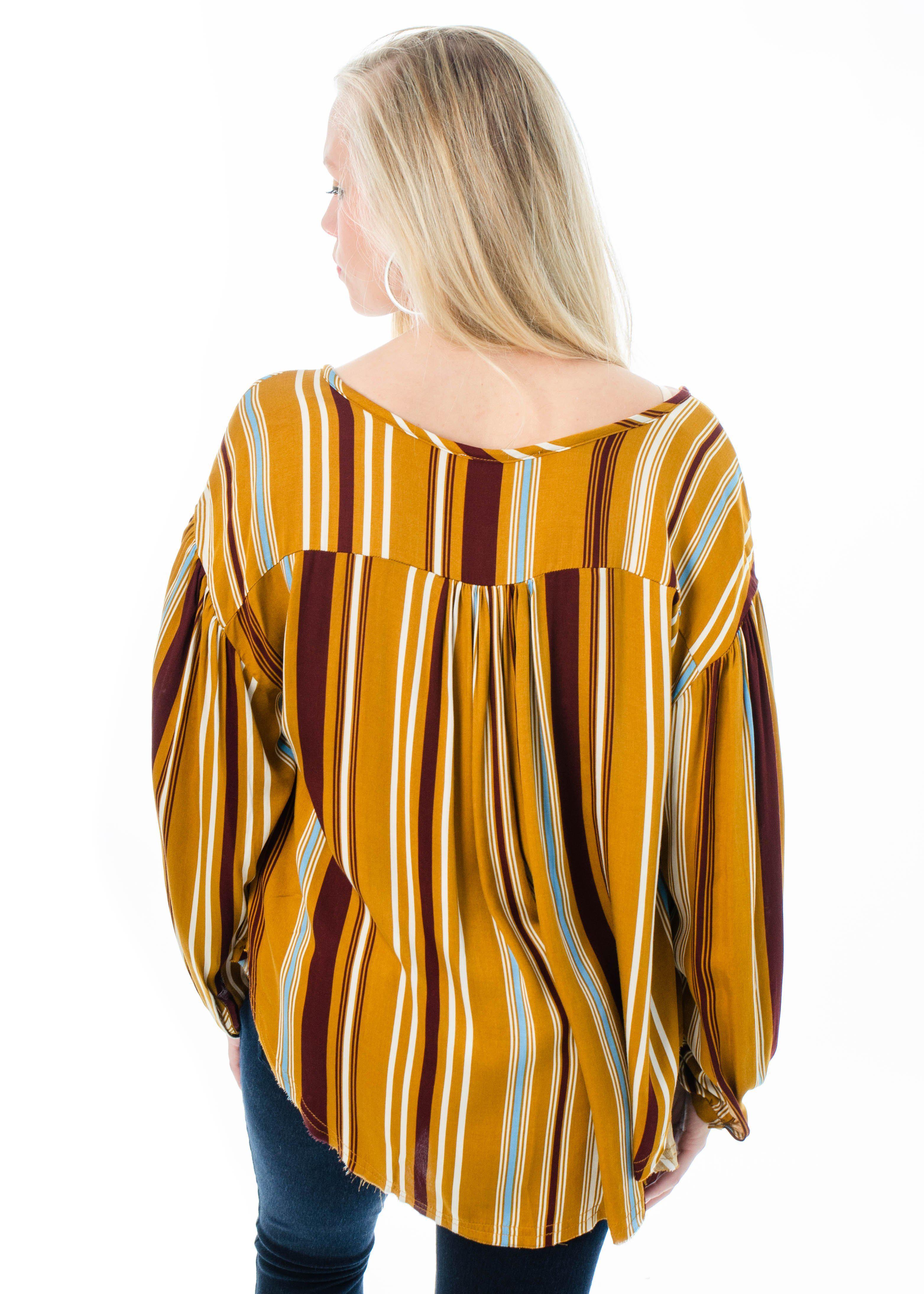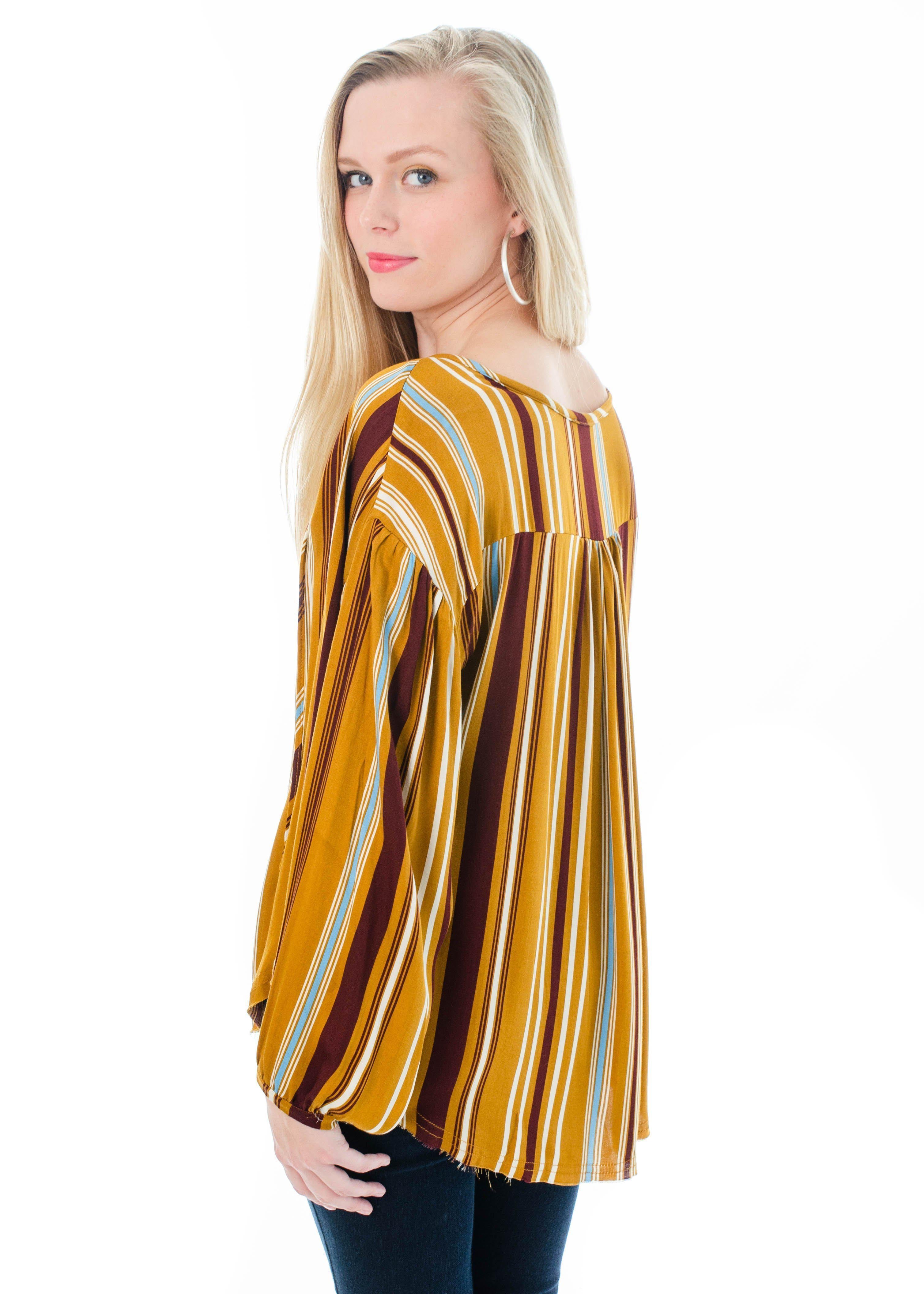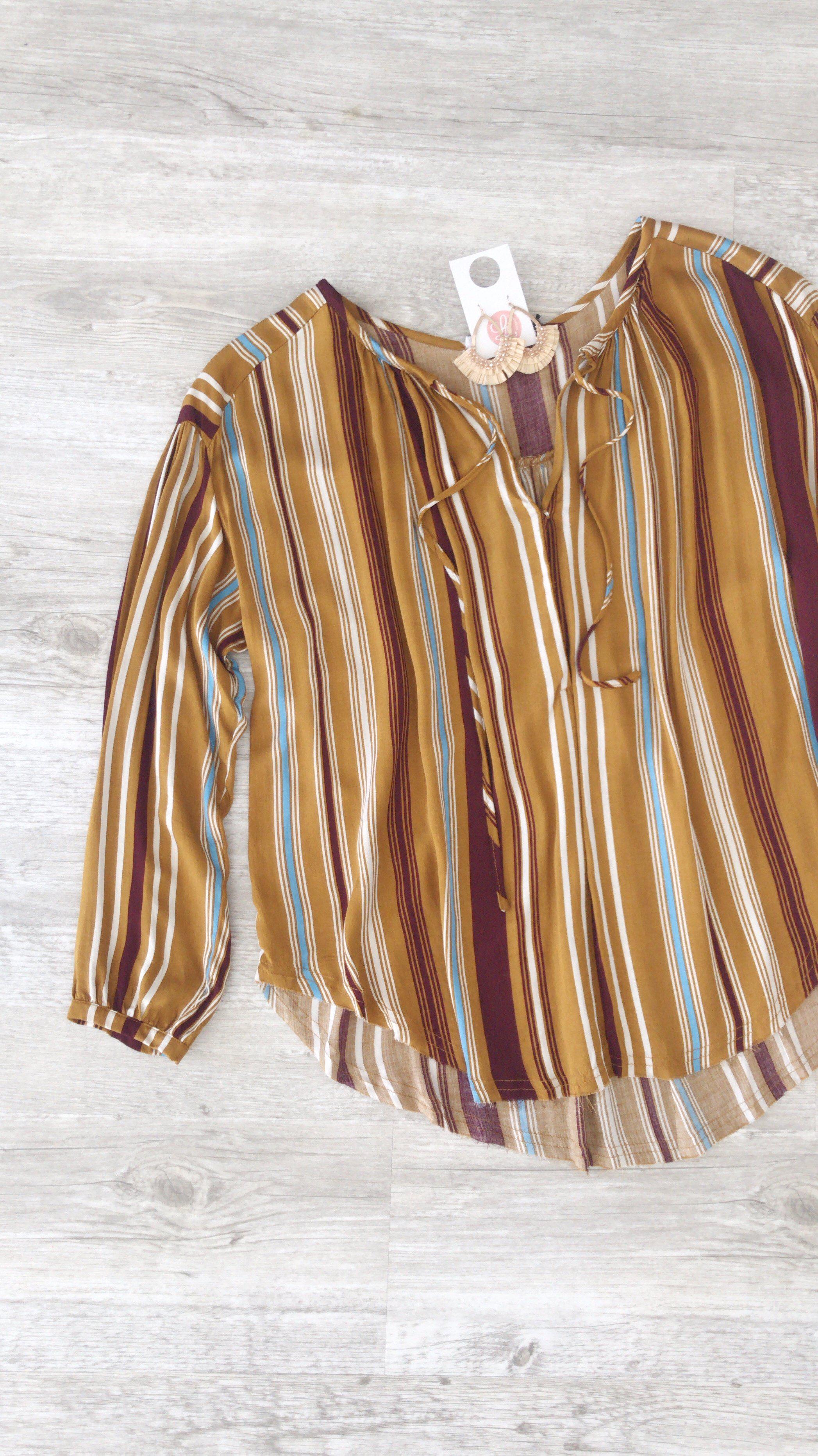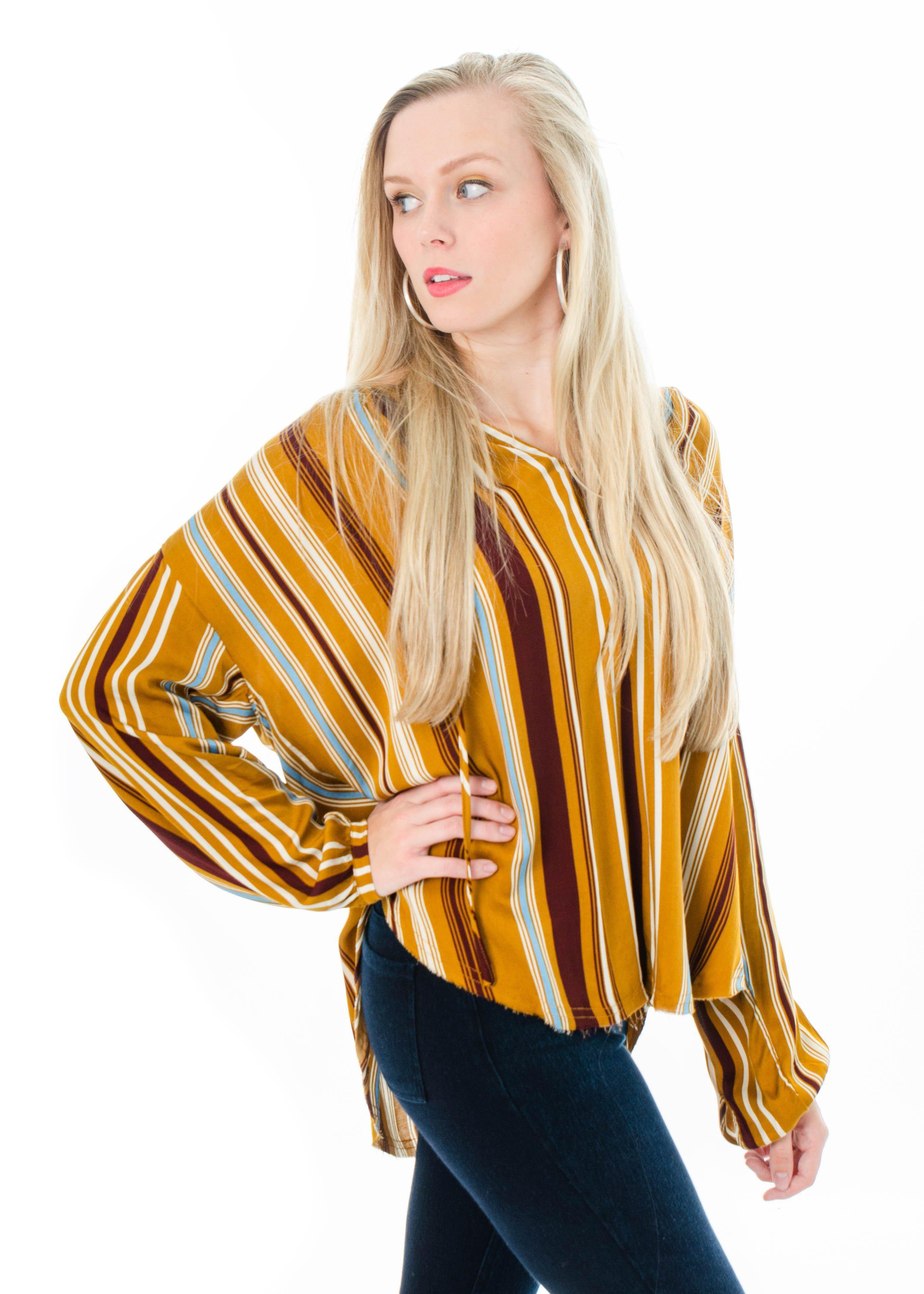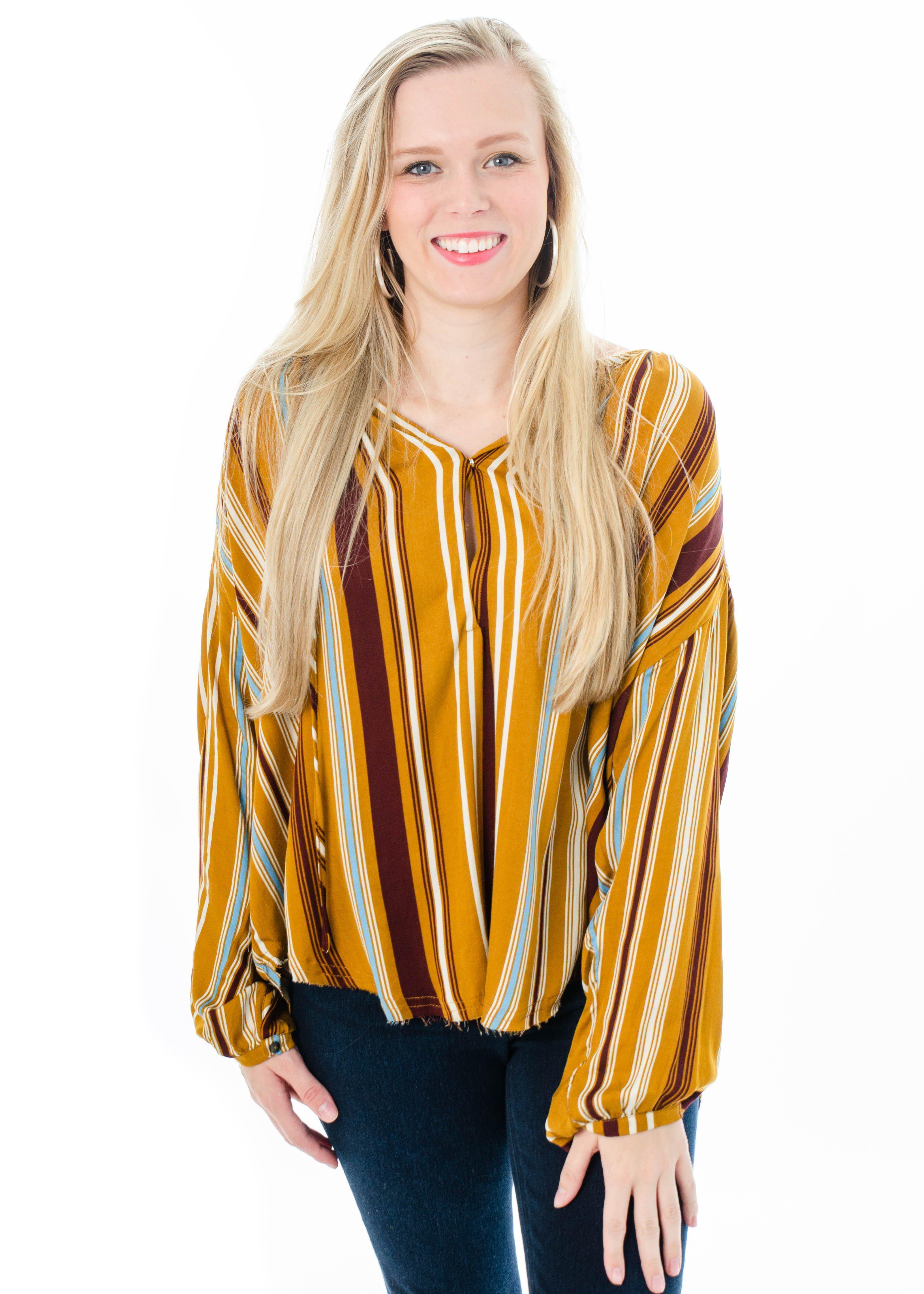 Whether you dress it up or down, Wild Mabel's Kairi Mustard Striped Satin Long Sleeve Top is always in style! Sleek and soft fabric, in a mustard, burgundy, and teal striped pattern, creates a surplice neckline, and long sleeves. Tuck this retro top into your favorite bell denim all fall long.