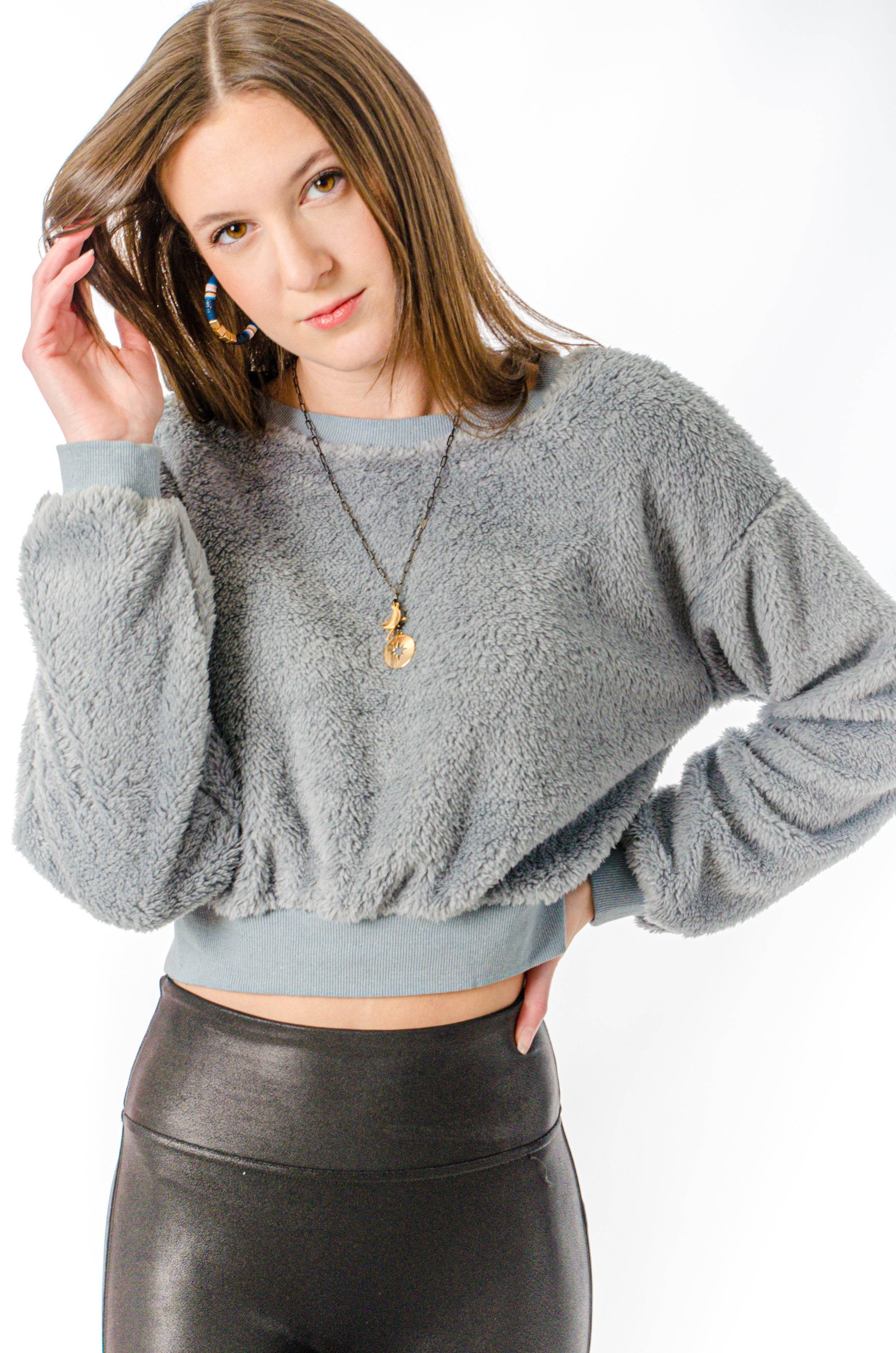 We can already see you wearing this dusty blue pullover with leggings, curled up on the couch on a Saturday afternoon, iced coffee in hand. This top features a round neckline, cropped cut, and long sleeves. Style this cozy number with sneakers and leggings!