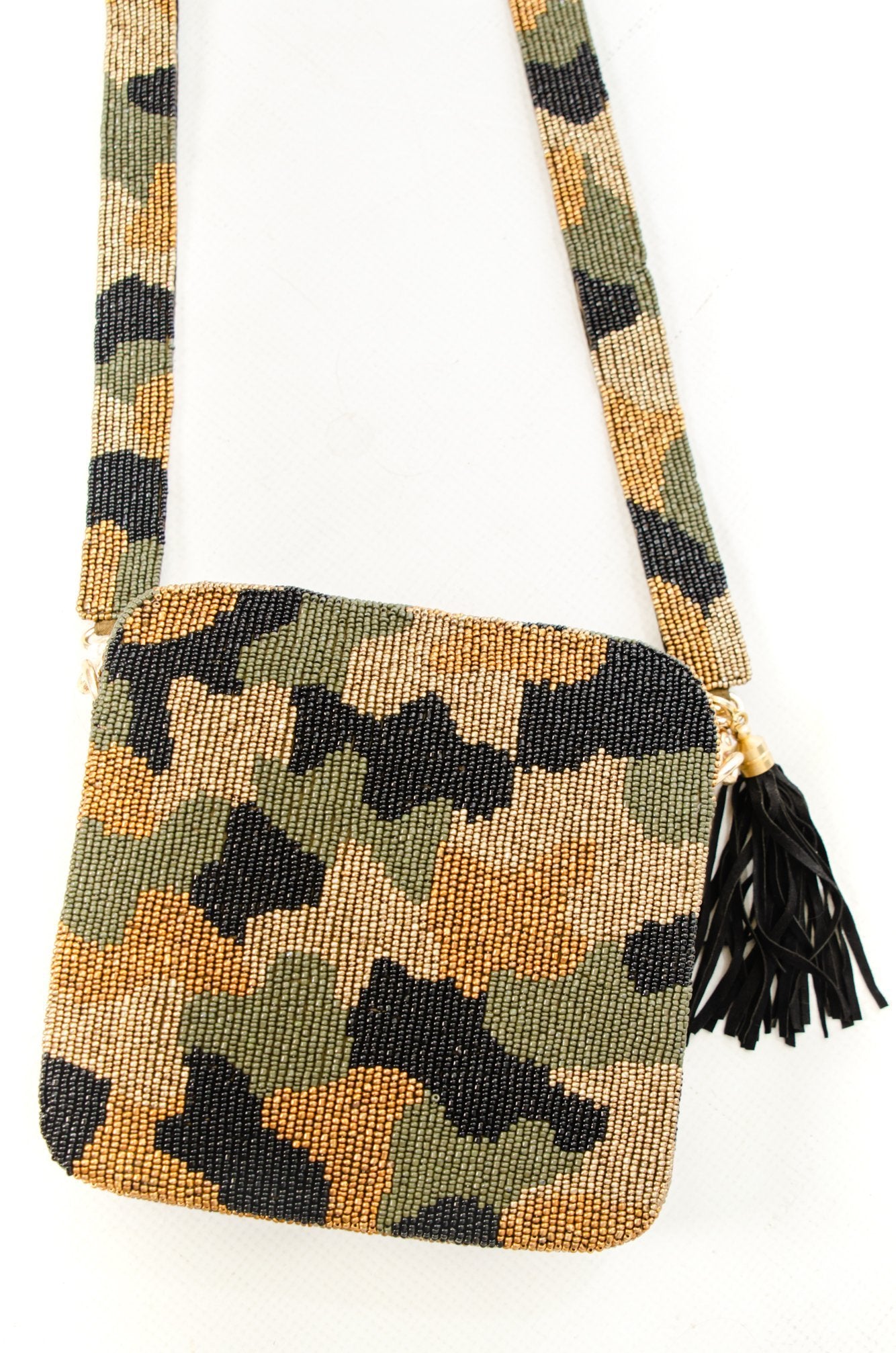 This Camo and Stripes Beaded bag is sure to turn some heads as you strut by! This custom hand-beaded bag is one of our favorites. Use it as an everyday bag or style it for a night out! Zipper closure on top. Strap length is 48" long and 6x6.
