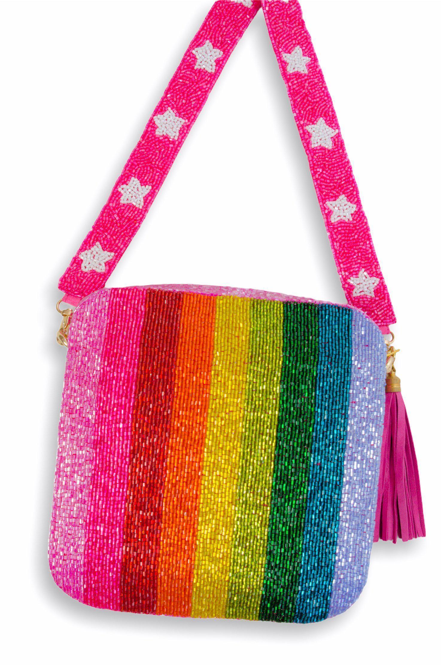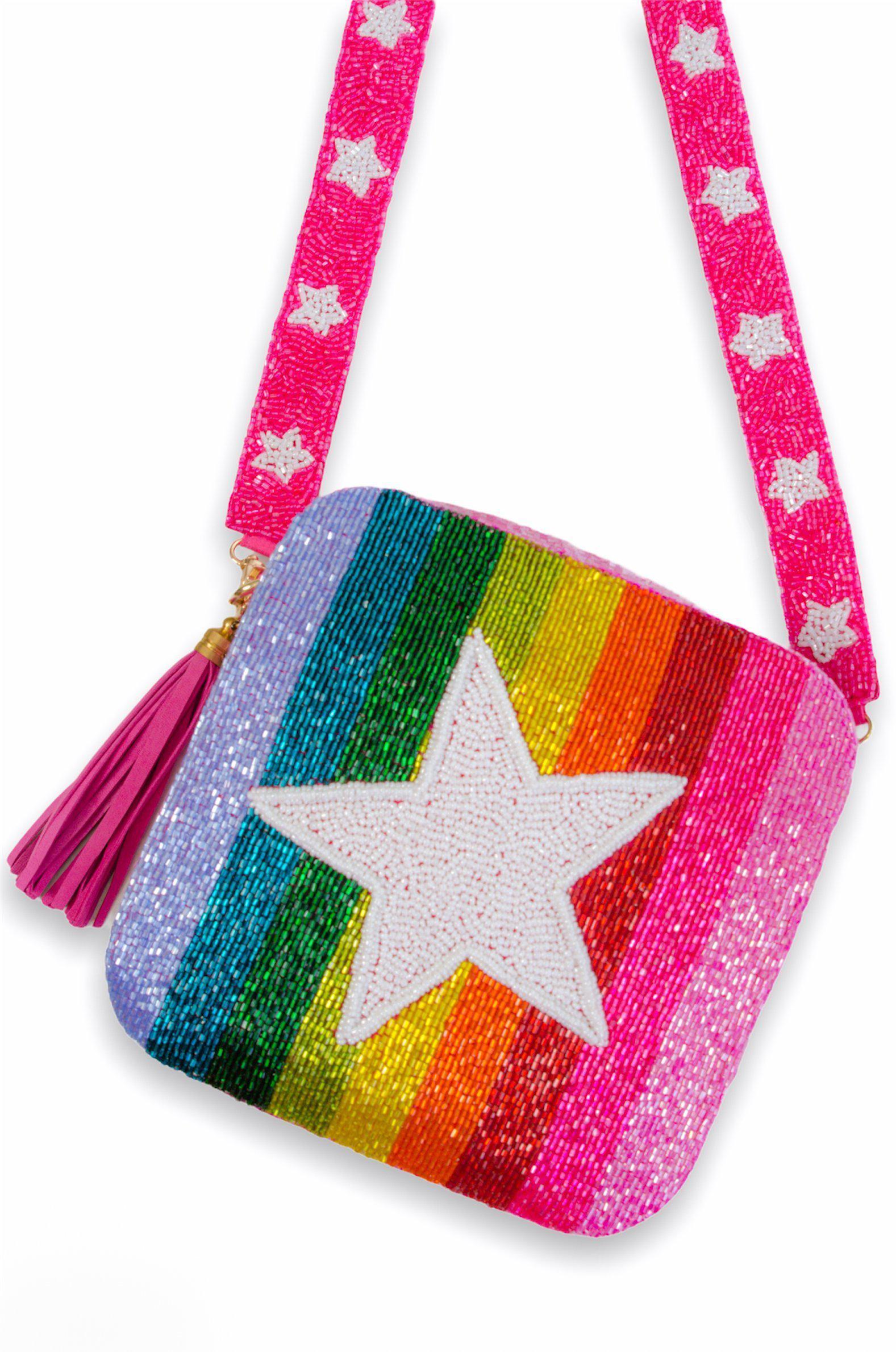 This Rainbow Star Beaded Bag is sure to turn heads as you strut by! This hand-beaded bag is one of our favorites! Use it as an everyday bag or style it for a night out! Zipper closure on top. Strap length is 48" long and the bag is 6x6.