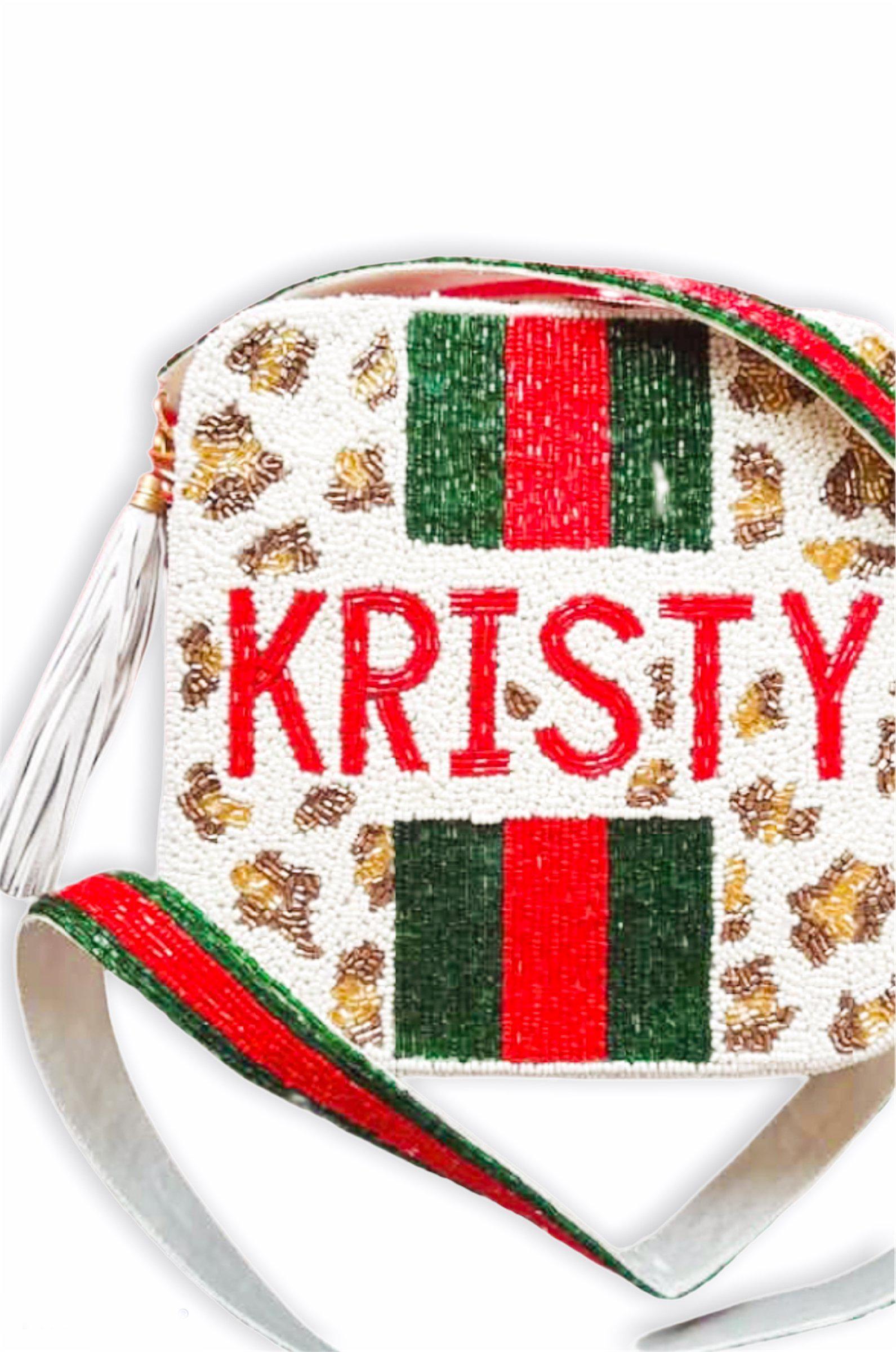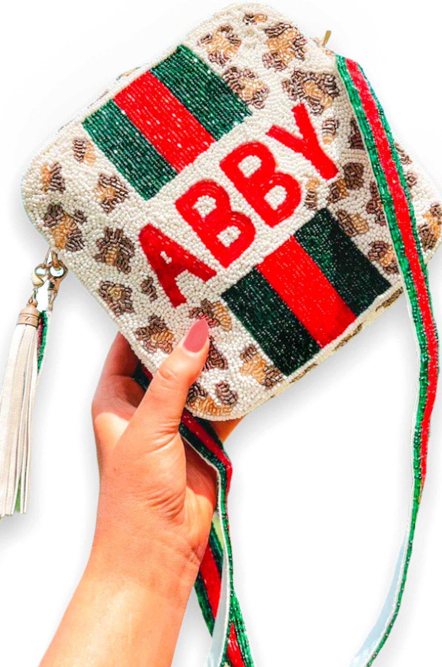 Custom Beaded Leopard Bag with Name - White / Red/Green is backordered and will ship as soon as it is back in stock.