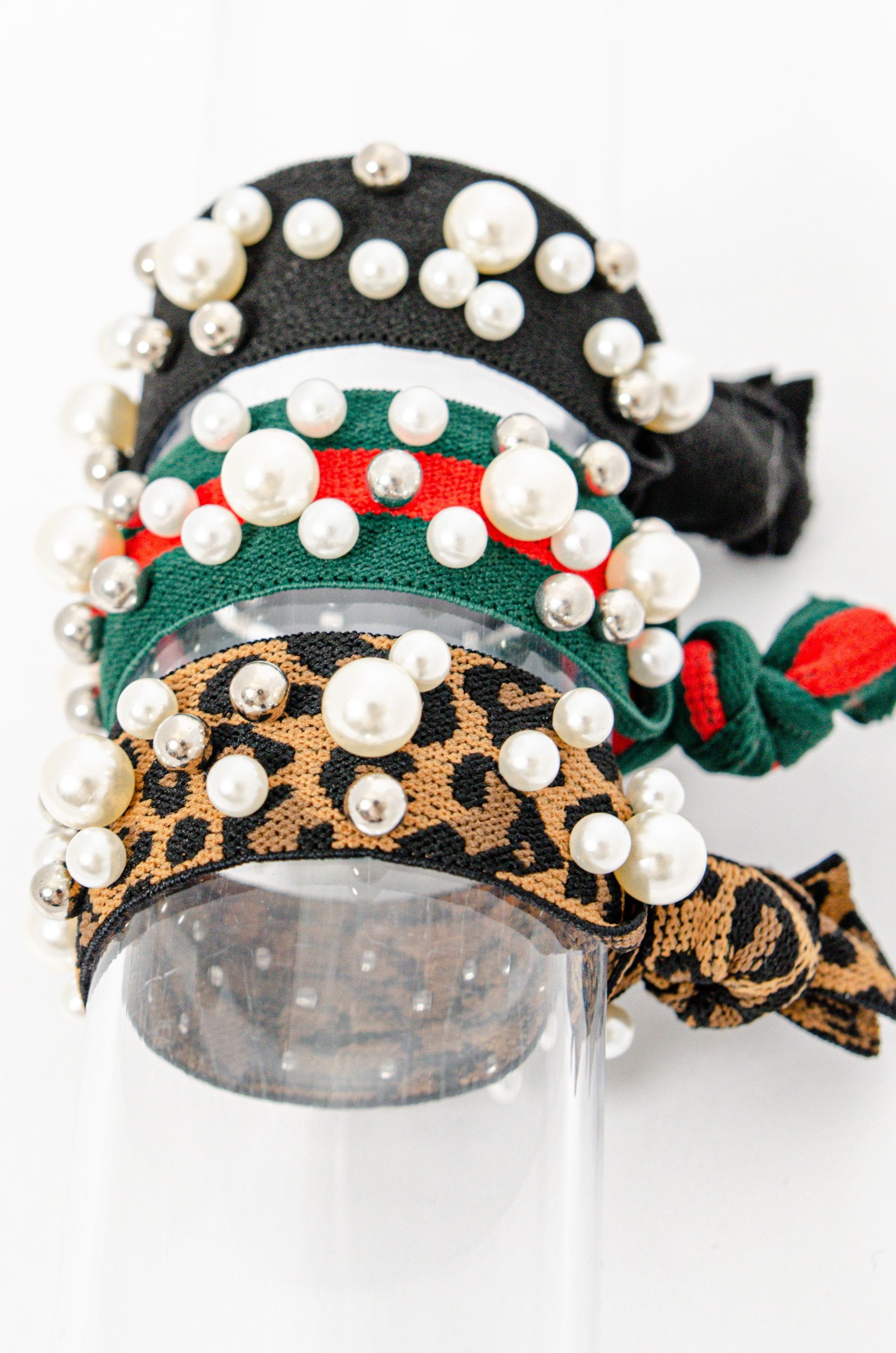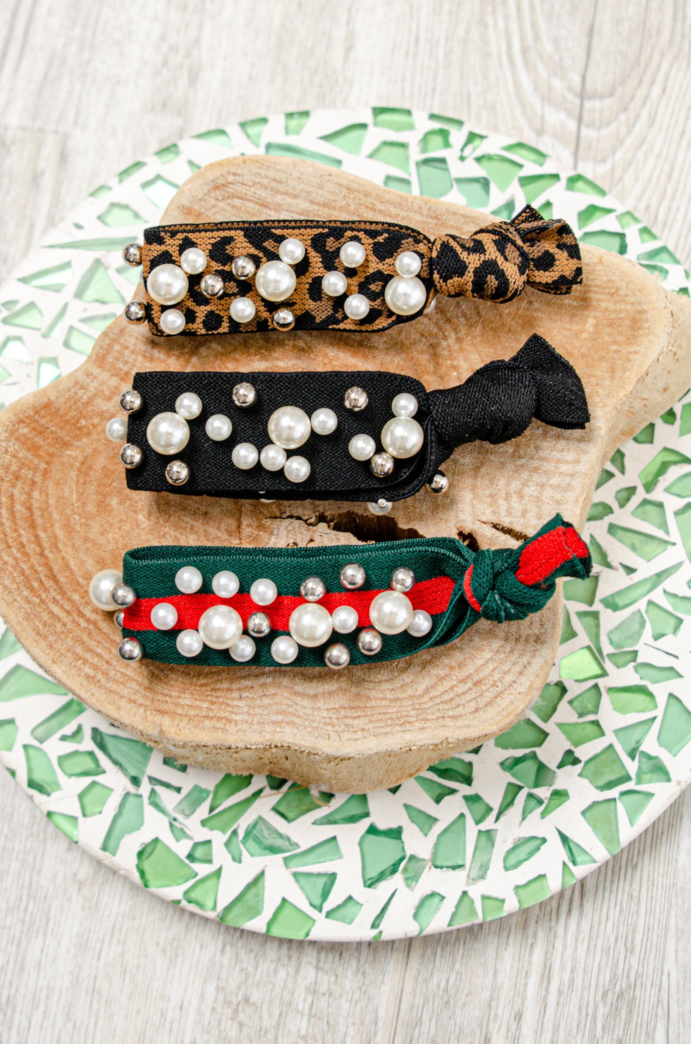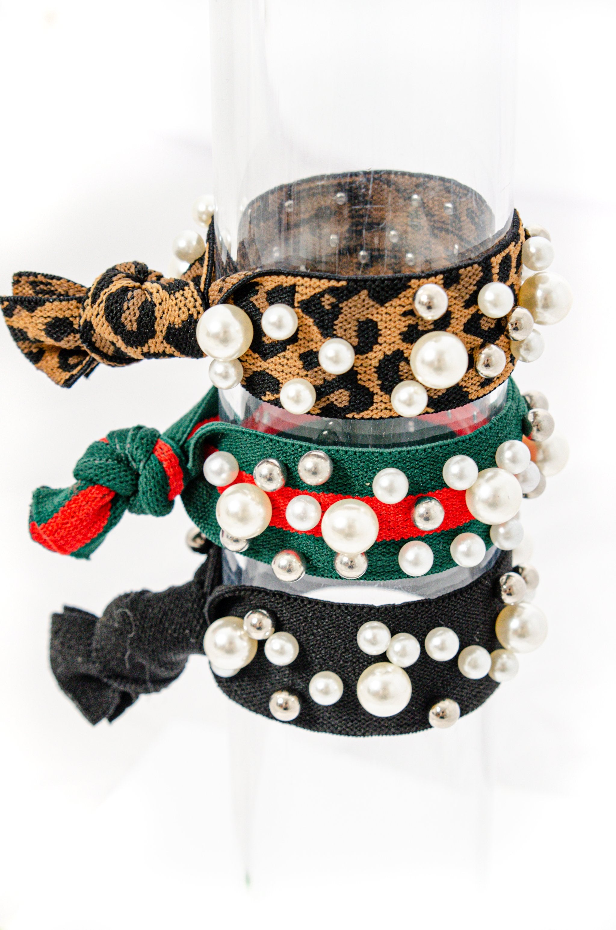 A new accessory we are all in love with! Wear this as a statement on your wrist or in your hair! Featuring embellished pearls all around and various patterns and colors. Style alone or with your favorite bracelets!