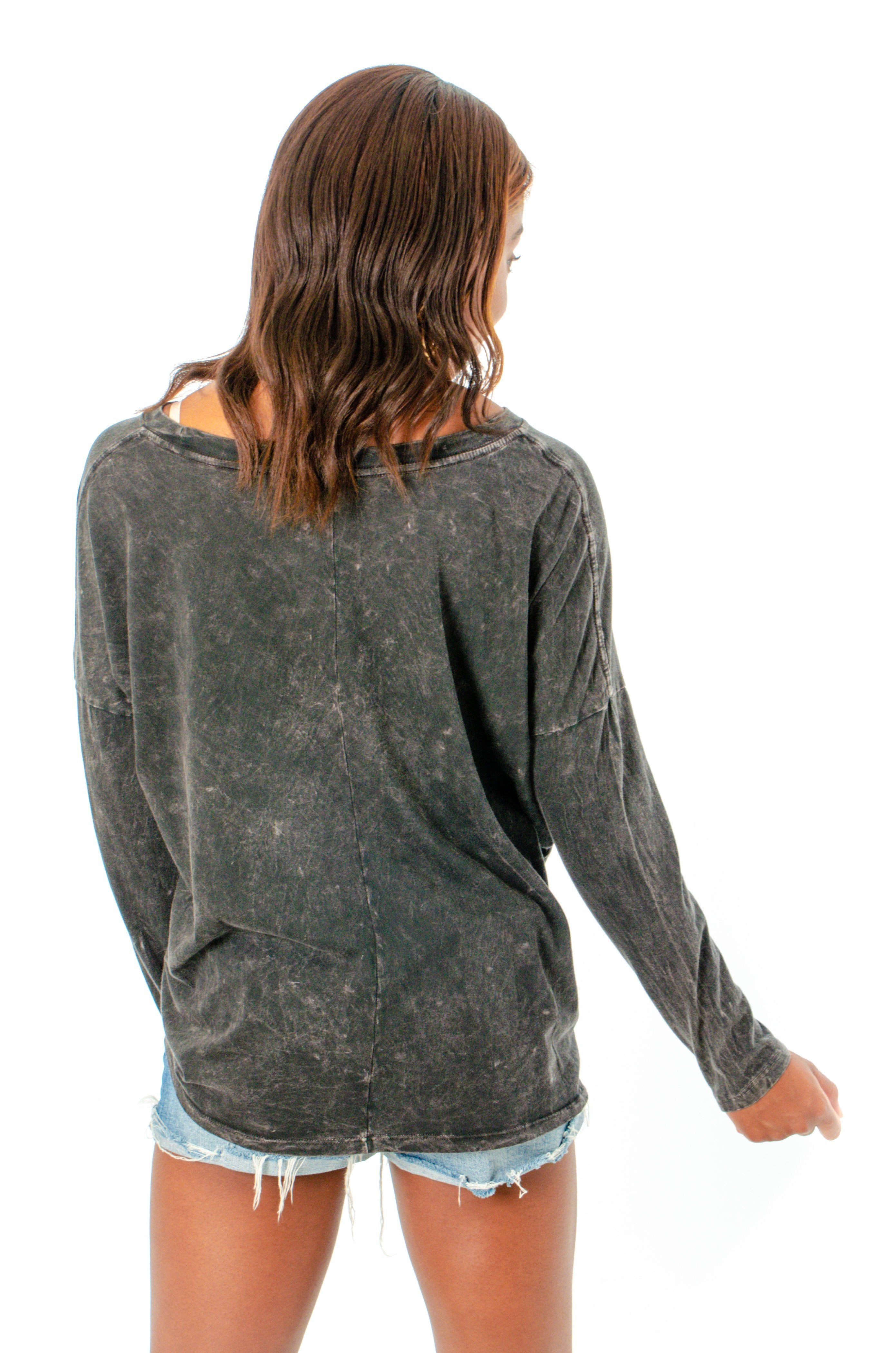The perfect cozy tee to express all of the weekend feelings! This top is a lightweight washed charcoal material with a scoop neckline and oversized fit. Style it with denim or comfy shorts!