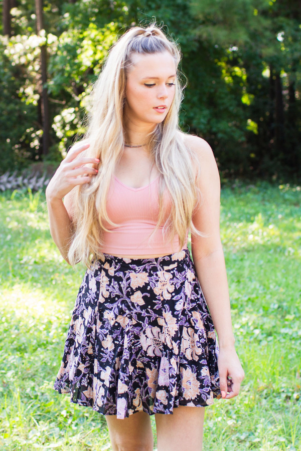 The Free People Black End Of The Island Godet Skirt is the perfect mix of feminine and flirty! Lightweight woven fabric, with a moody floral print in shades of pink, purple, and white, shapes this dreamy skirt that falls from a high banded waist into a flowy mini hem. Hidden back zipper.