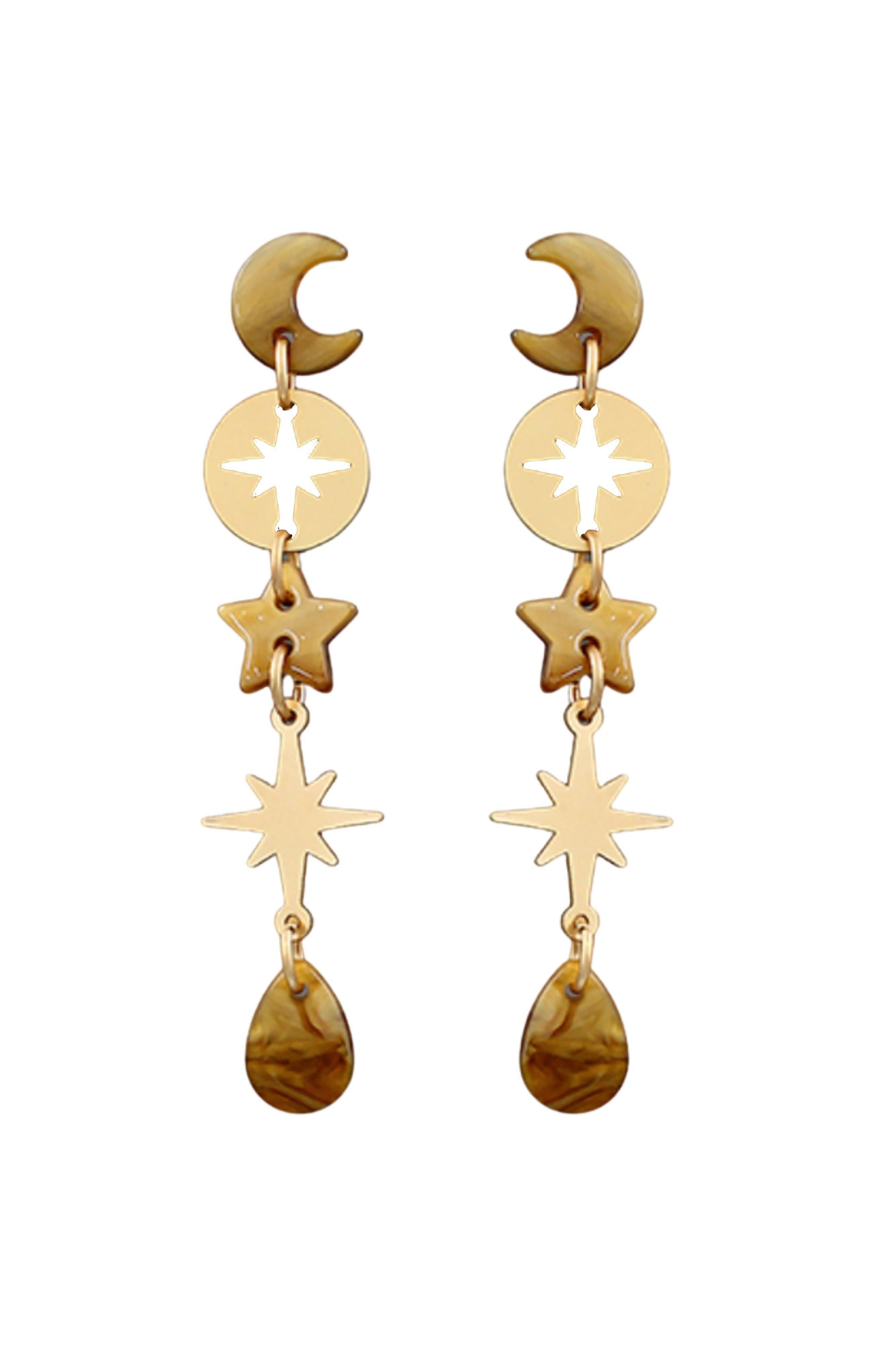 Day or night, the Wild Mabel Stars & Moons Linear Earrings are sure to shine! Alternating gold and natural acrylic celestial charms cascade down these versatile drop earrings.