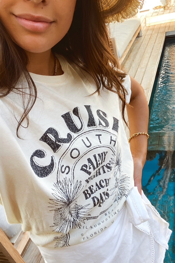 Cruise down South in this new graphic tee! This top is a lightweight cotton and has a scoop neck, making you feel cute, cozy and ready to go all at the same time!