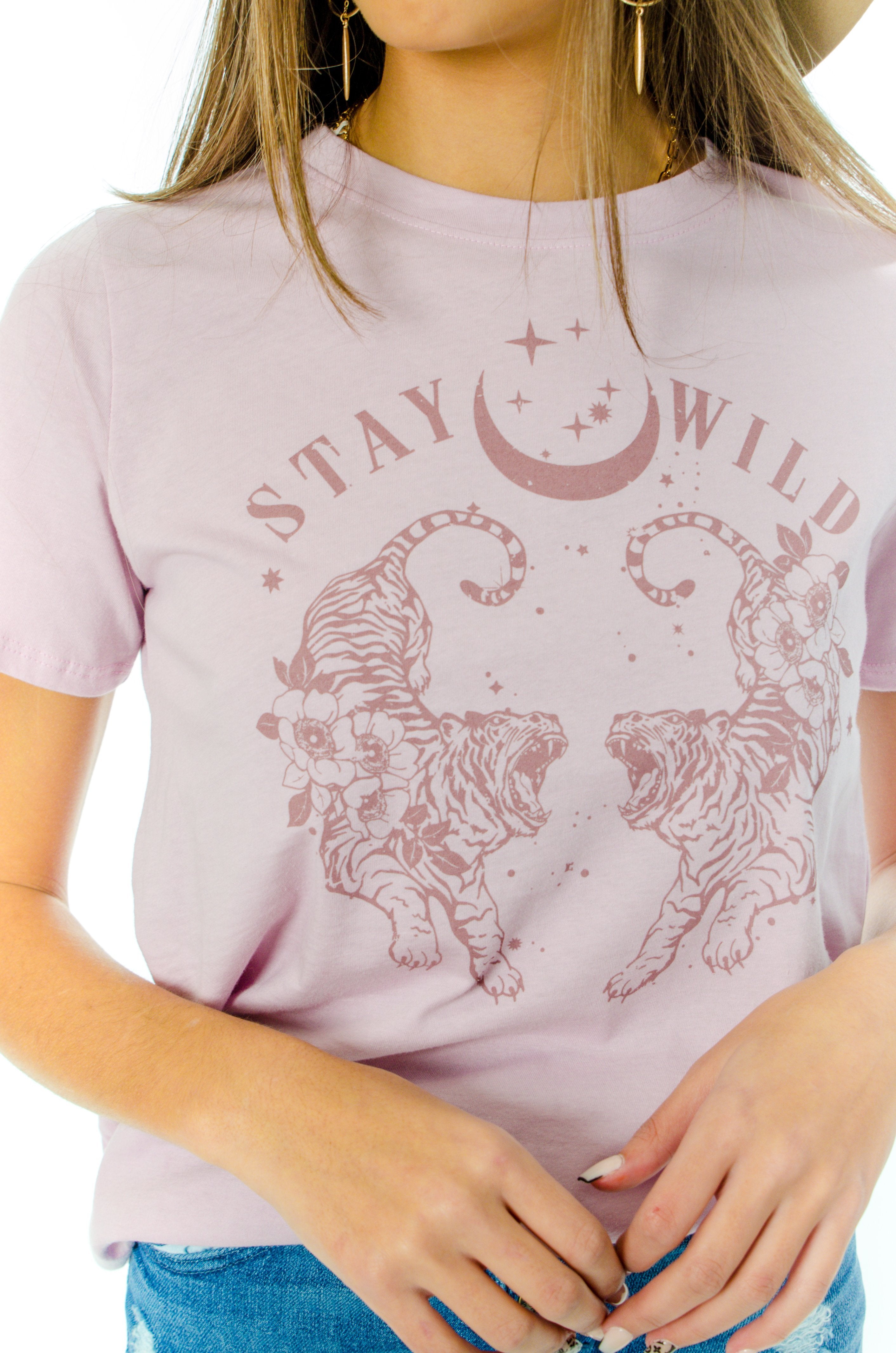 Add some wild to your graphic tee collection! This lavender tee is great to pair with jeans or shorts! This trendy light purple t-shirt features soft fabric and longer length that’s great for tucking or tying. Keep it casual with some tennis shoes!