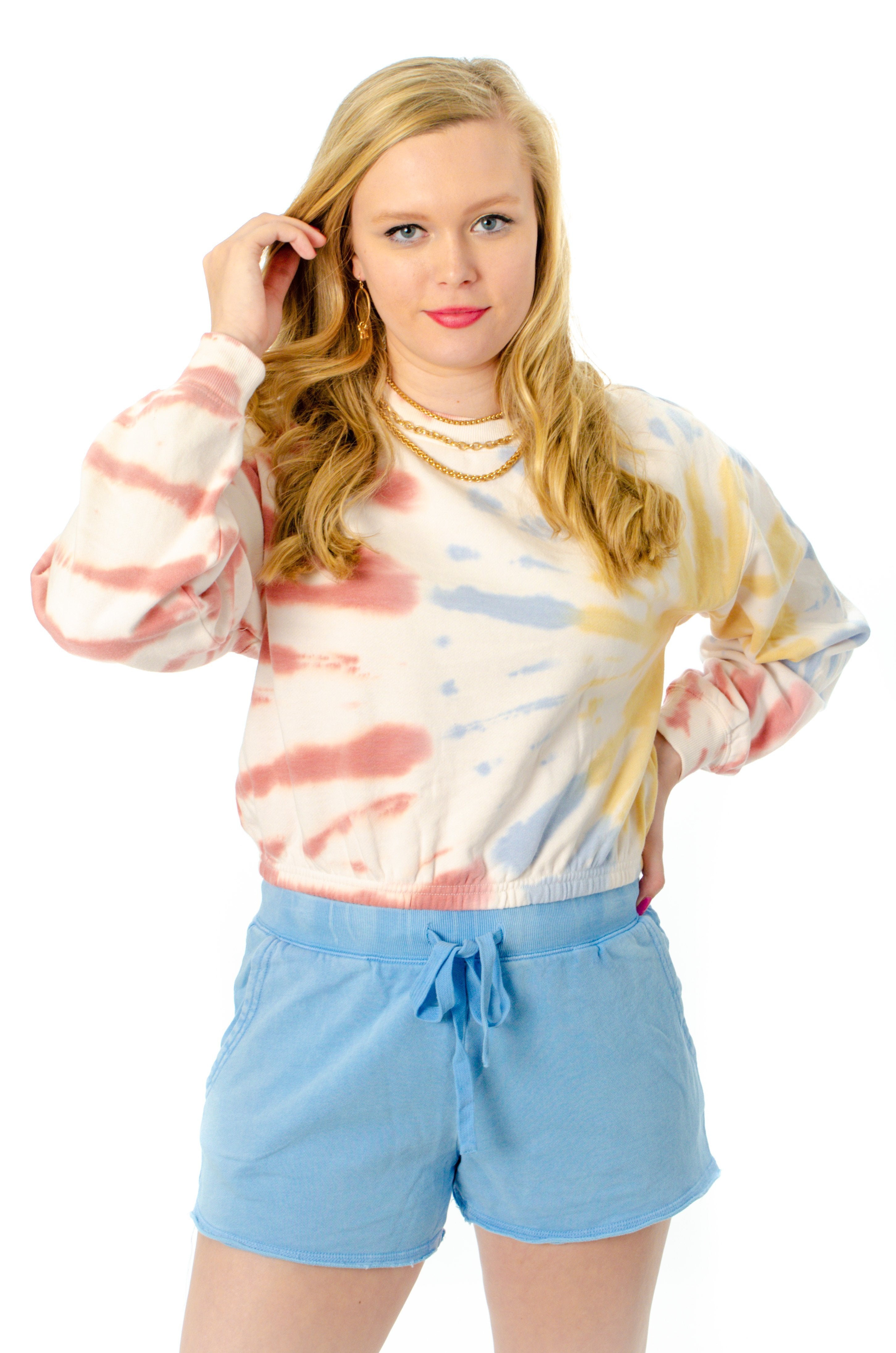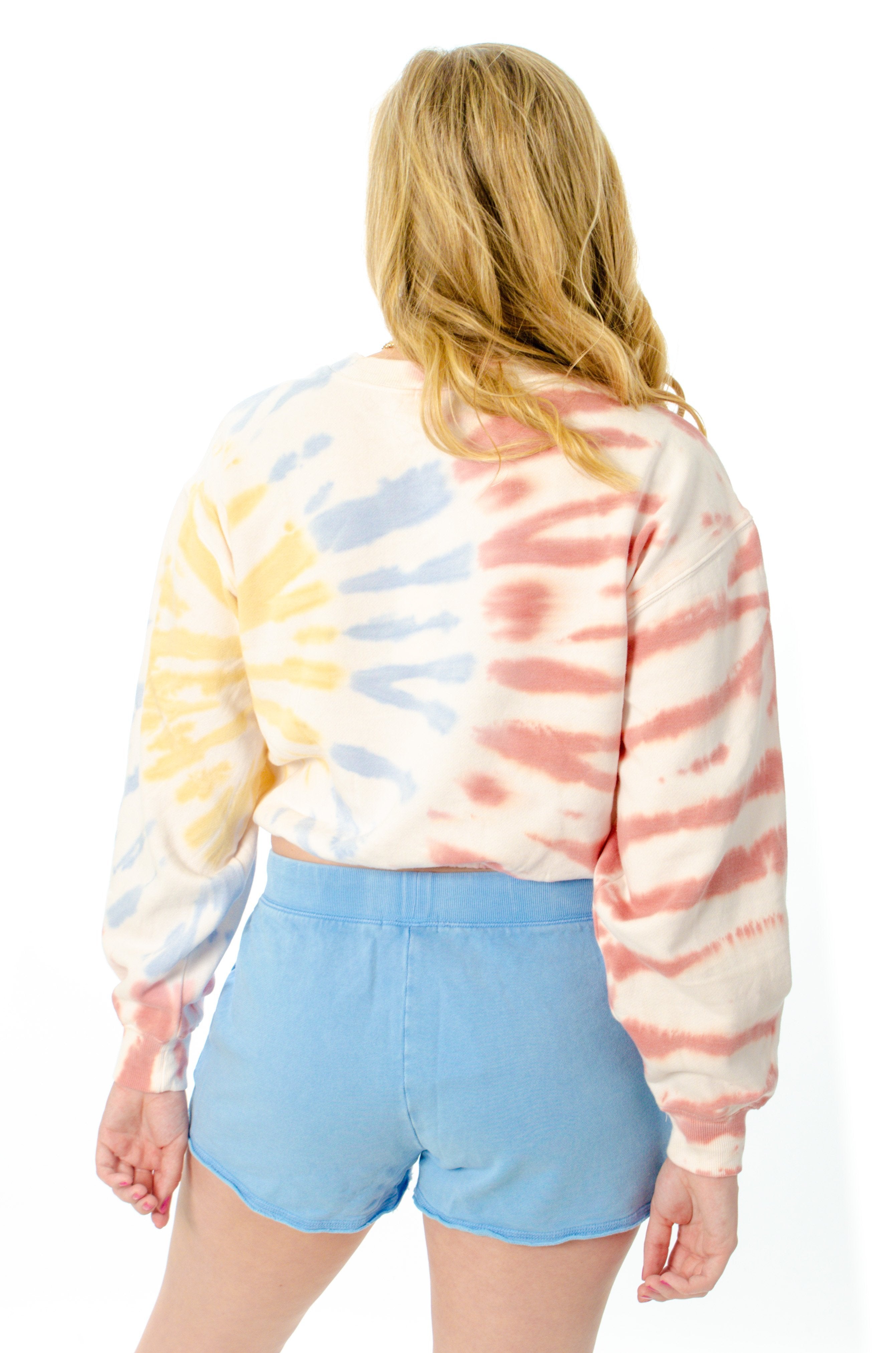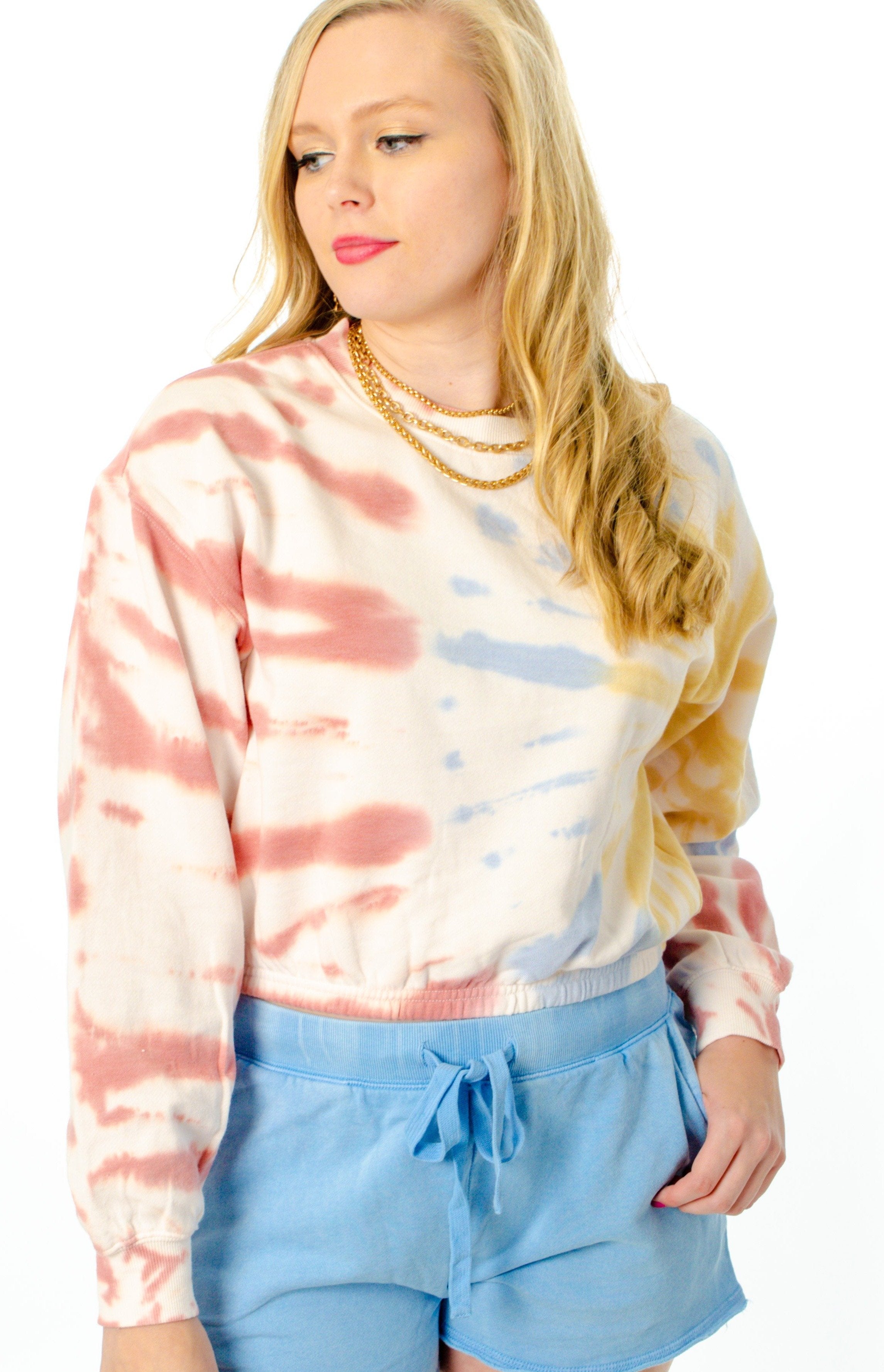 Give your wardrobe an explosion of color with the Britton Tie-Dye Pullover! This cropped sweatshirt has that perfect combination of bright colors and a faded, washed effect.
