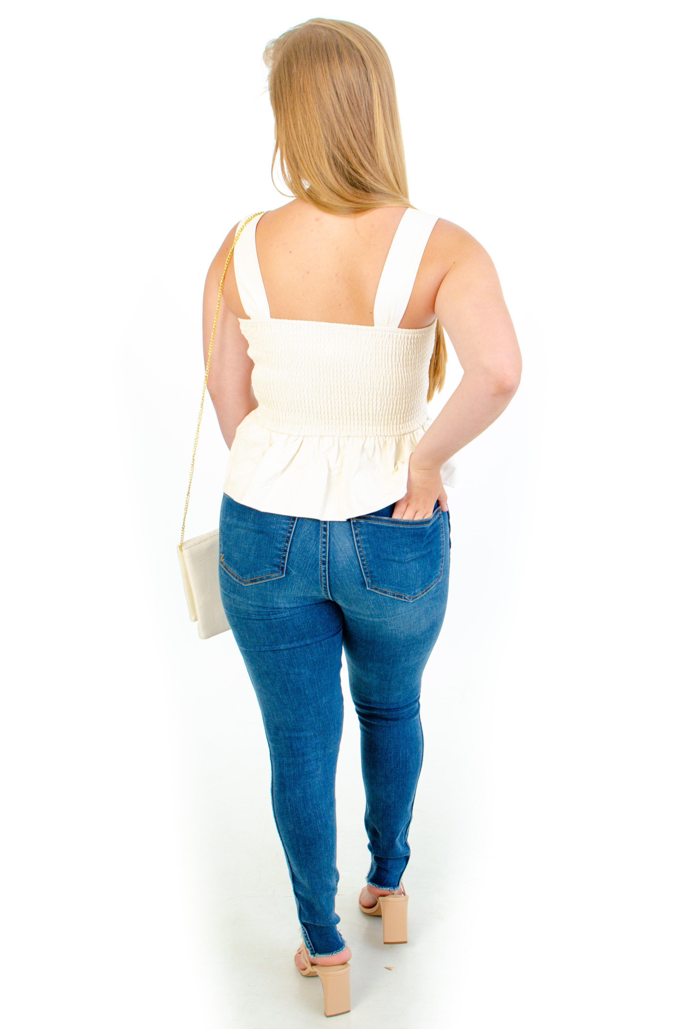 Our love is all for you... and this top! L Mae's All Faux You Cream Leather Smocked Tank is an adorable peplum fit! Featuring smocking throughout the bodice and thick tank straps. A square neckline and faux leather material. andThis top is finished by a ruffled. We love this top paired with some trendy denim and heels! Also available in Olive.