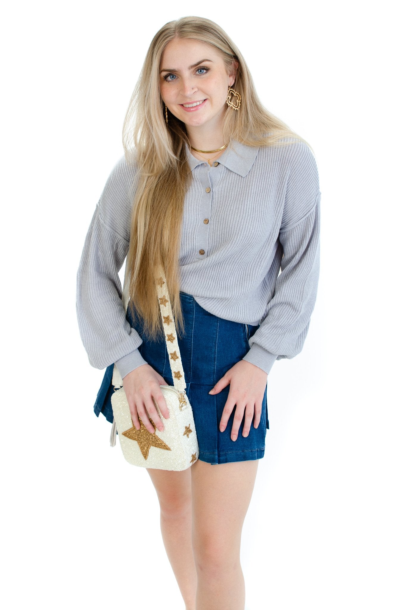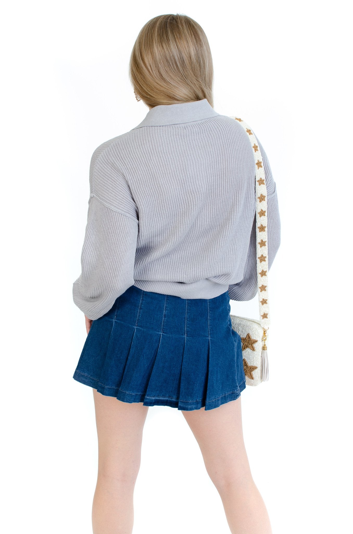 We've styled it with our true to blue denim skirt! We love this top for the winter and fall. Wear it with some sneaks or booties!