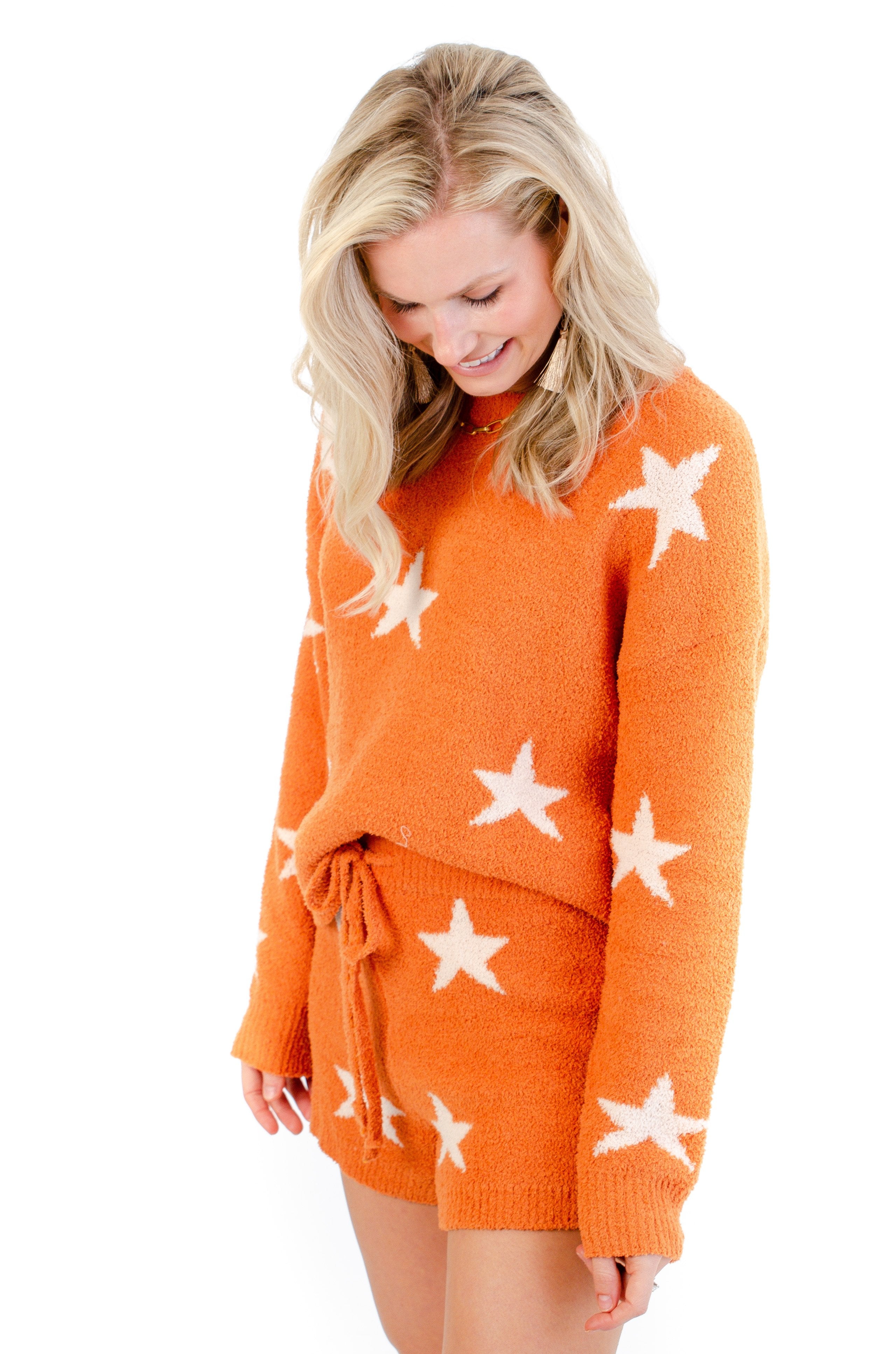 Wild Mabel's Lucky Stars Orange Set is the softest set you'll ever own! A cozy fleece material that you'll love wrapping up in. This set is a bright orange color with white stars sprinkled all throughout. The top is long sleeve with dropped shoulders and a crew neckline. The shorts have an elastic drawstring waist so you can adjust the fit!