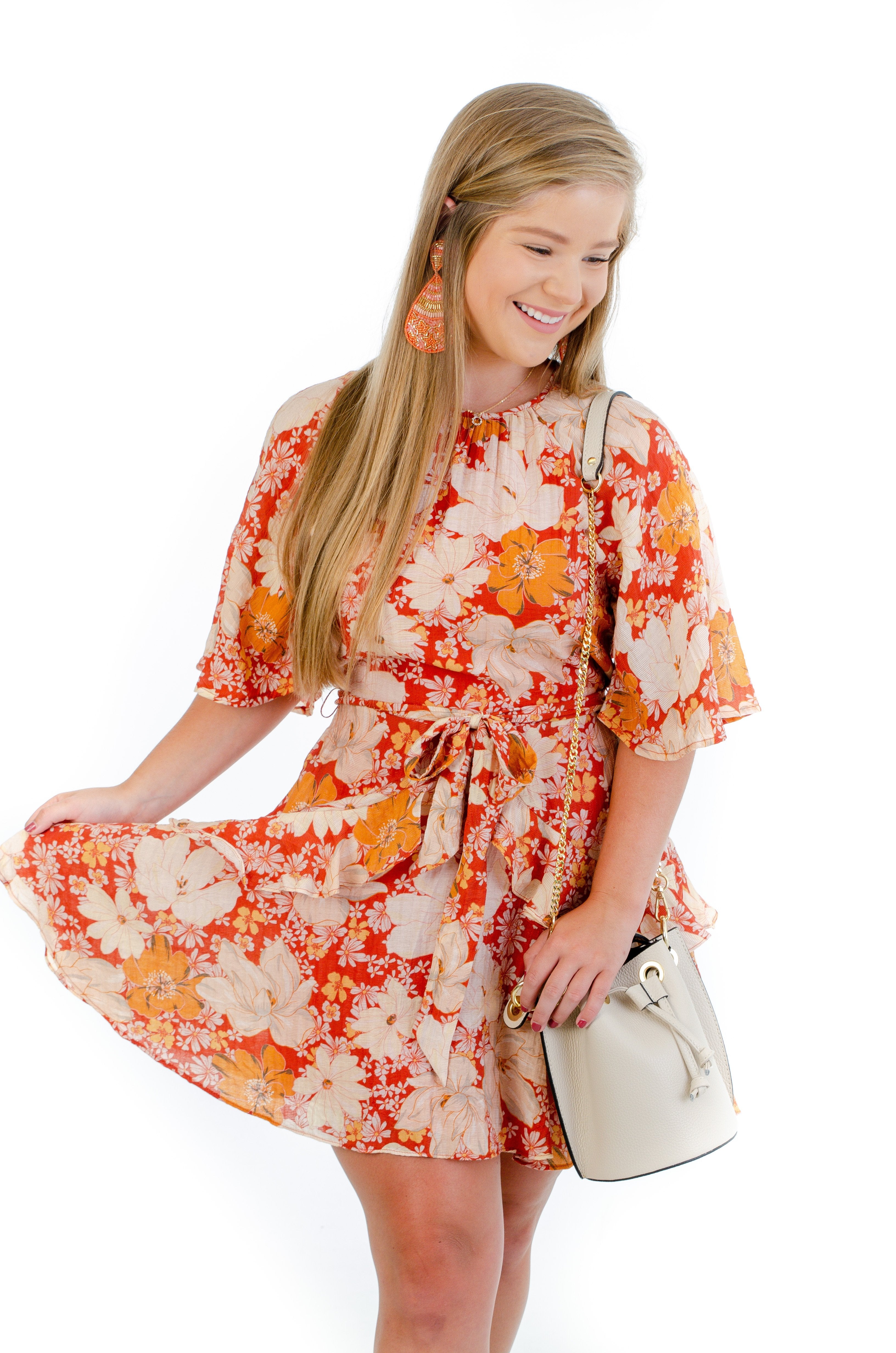 This Mink Pink Azar Frill Mini Dress, is the most adorable dress that you need for your closet! It features a pink floral print that is an easy transition into the fall. Pair this mini dress with a pair of heels and statement gold hoop to complete the look!