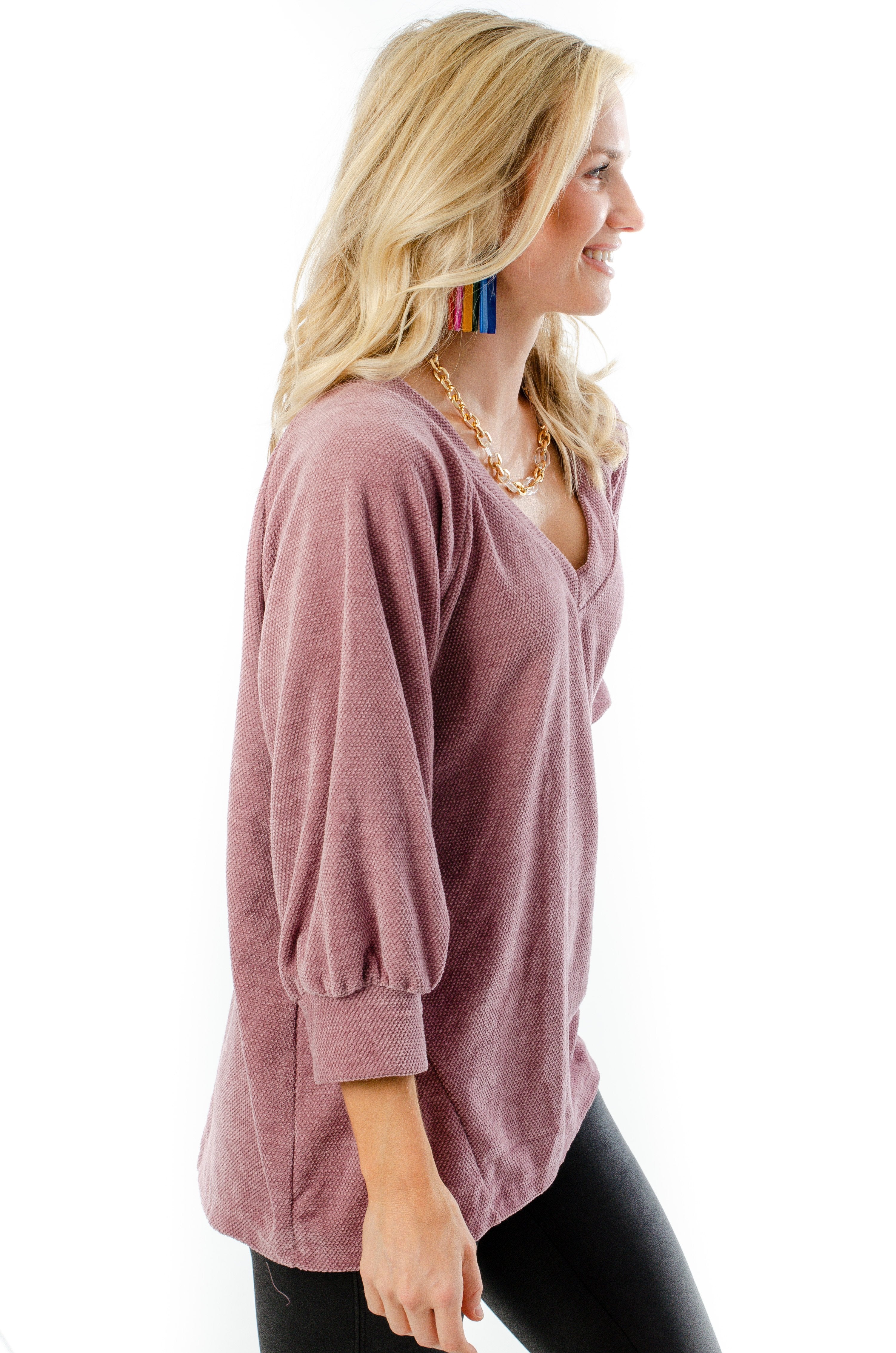 More, please! We will never get enough of Wild Mabel's More Mauve Balloon Sleeve Sweater. This raglan top features a thick, textured material, a v-neckline, three-quarter balloon sleeves, and an oversized bodice. Pair this must-have mauve top with a pair of Spanx leggings and some statement jewelry for a complete look!