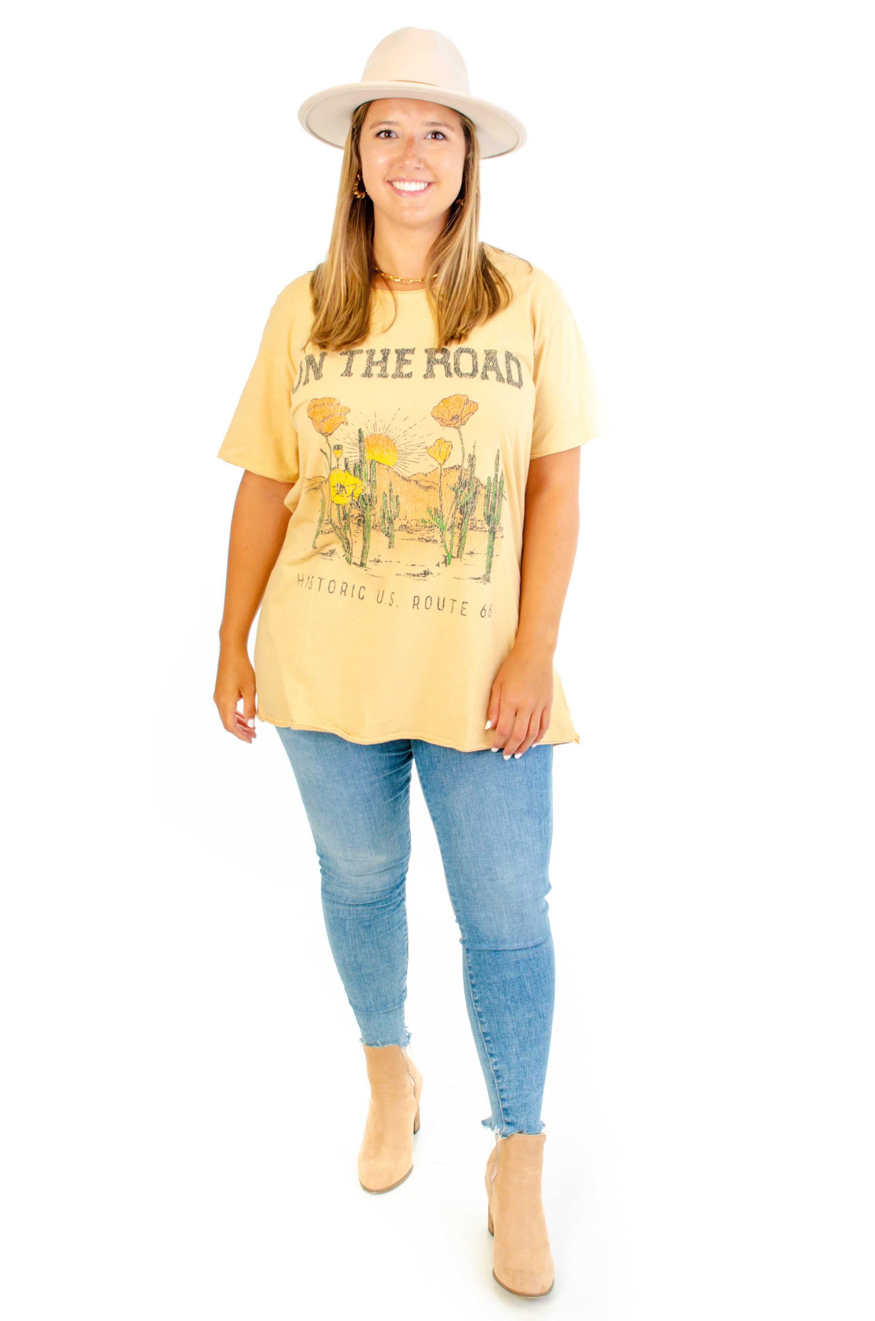 Hit the road in this new Airport Tee! This tee has a scoop neck with a vintage inspired California Poppy graphic. Look cute and comfy in this Airport Tee! This tee fits very oversized. Models are wearing sizes small and medium. Style with denim or leggings!