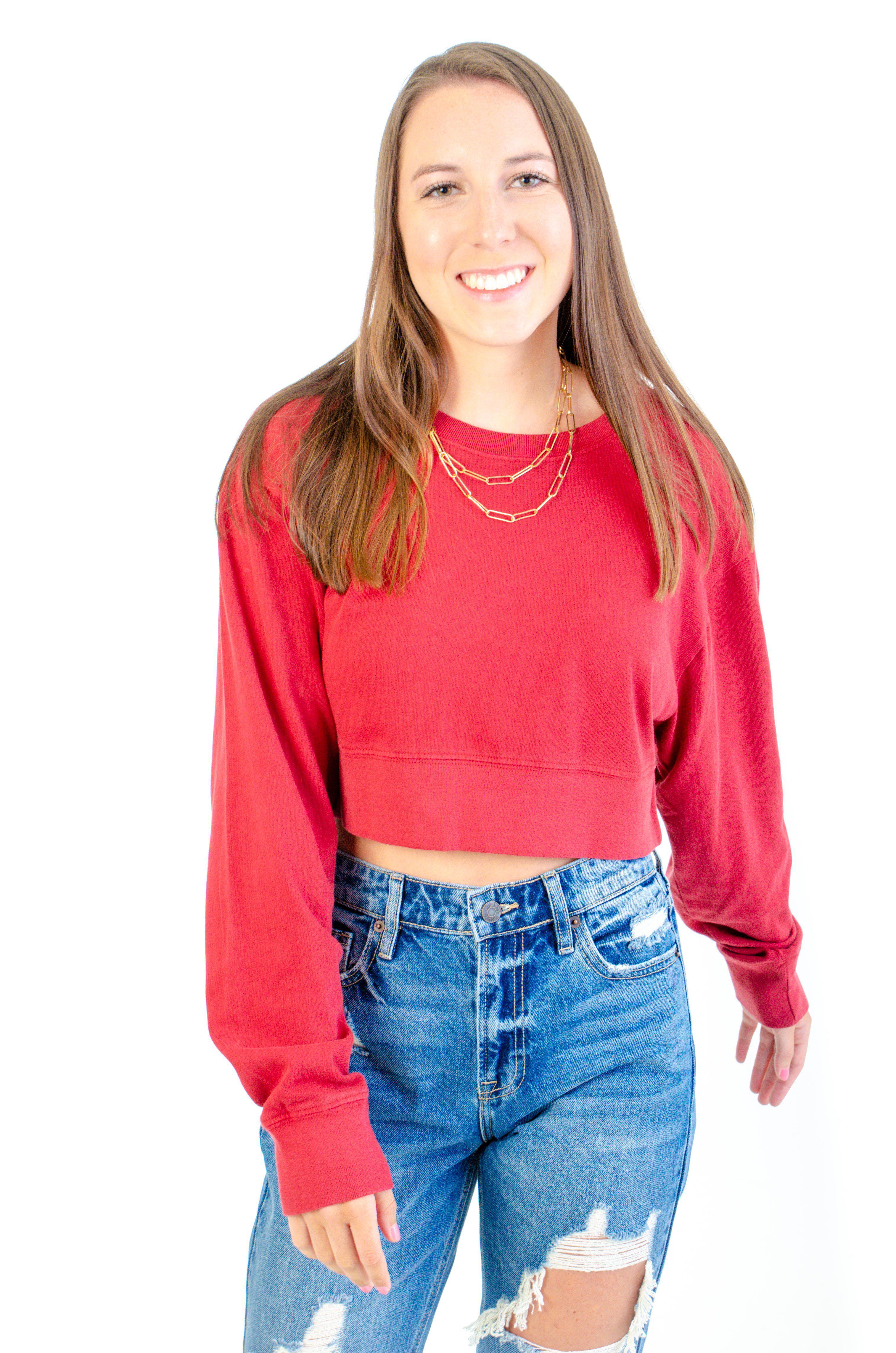 This top has a relaxed effortless look that is so chill, you'll wear it on repeat! A burgundy color perfect for the Fall, this Cropped knit top is a sweatshirt material with a scoop neckline. Long cozy sleeves and a solid color all around. This top is perfect with denim, skorts, leggings, or joggers. Basically, we know you'll wear this as much as possible! This top is also available in a lavender color!