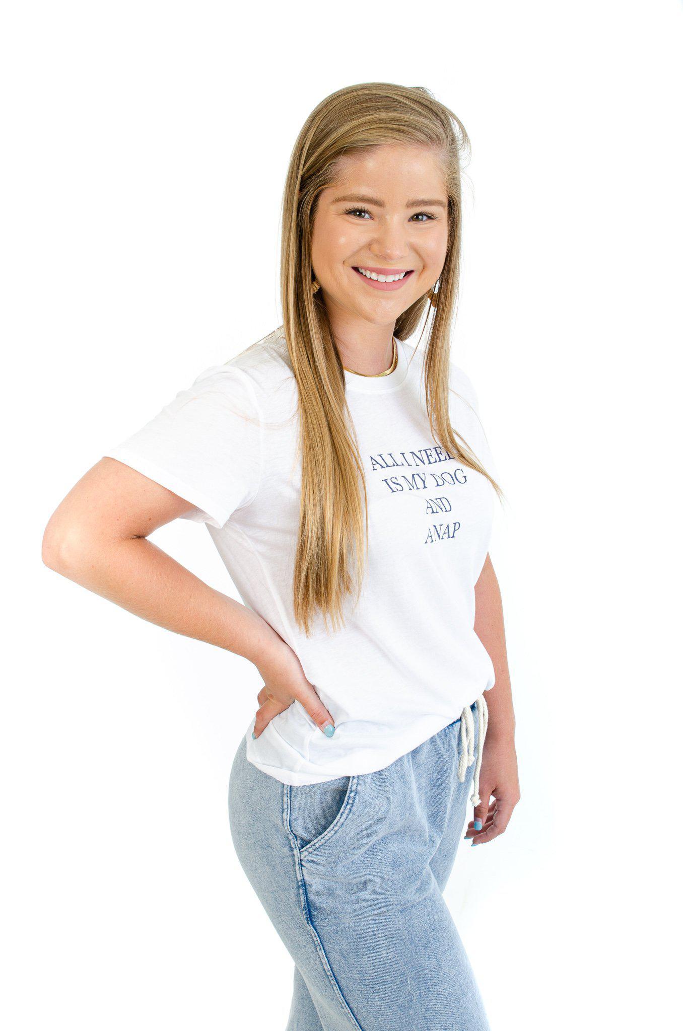 Dogs are a woman's best friend! Soft and breathable cotton material makes up this comfy tee that features a signature "easy" body style. The timeless crewneck design goes so well with jeans and has the words "All I Need Is My Dog And A Nap" printed on the front.