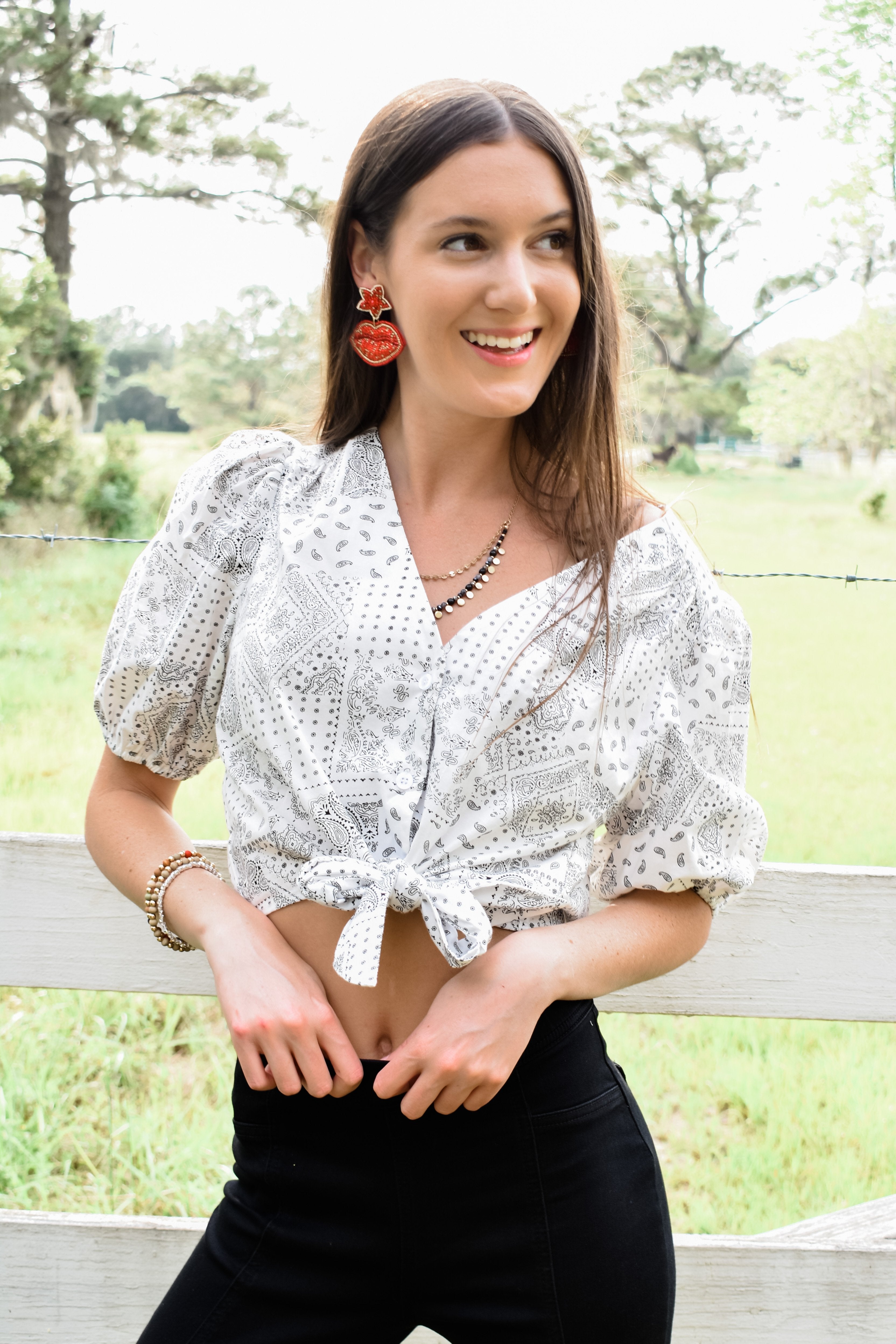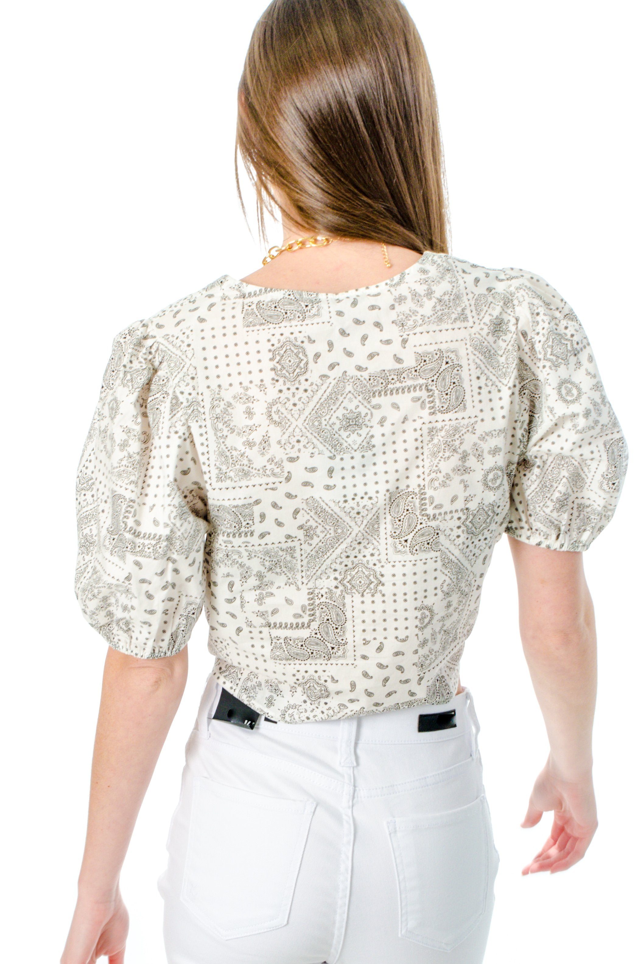 Wild Mabel’s Puff Sleeve Bandana Top is a Summer top we are all crushing on! This top features a cropped fit, buttons down the front, and a tie detail. This Bandana crop top is a thin material so you wont be too warm on those Summer nights!
